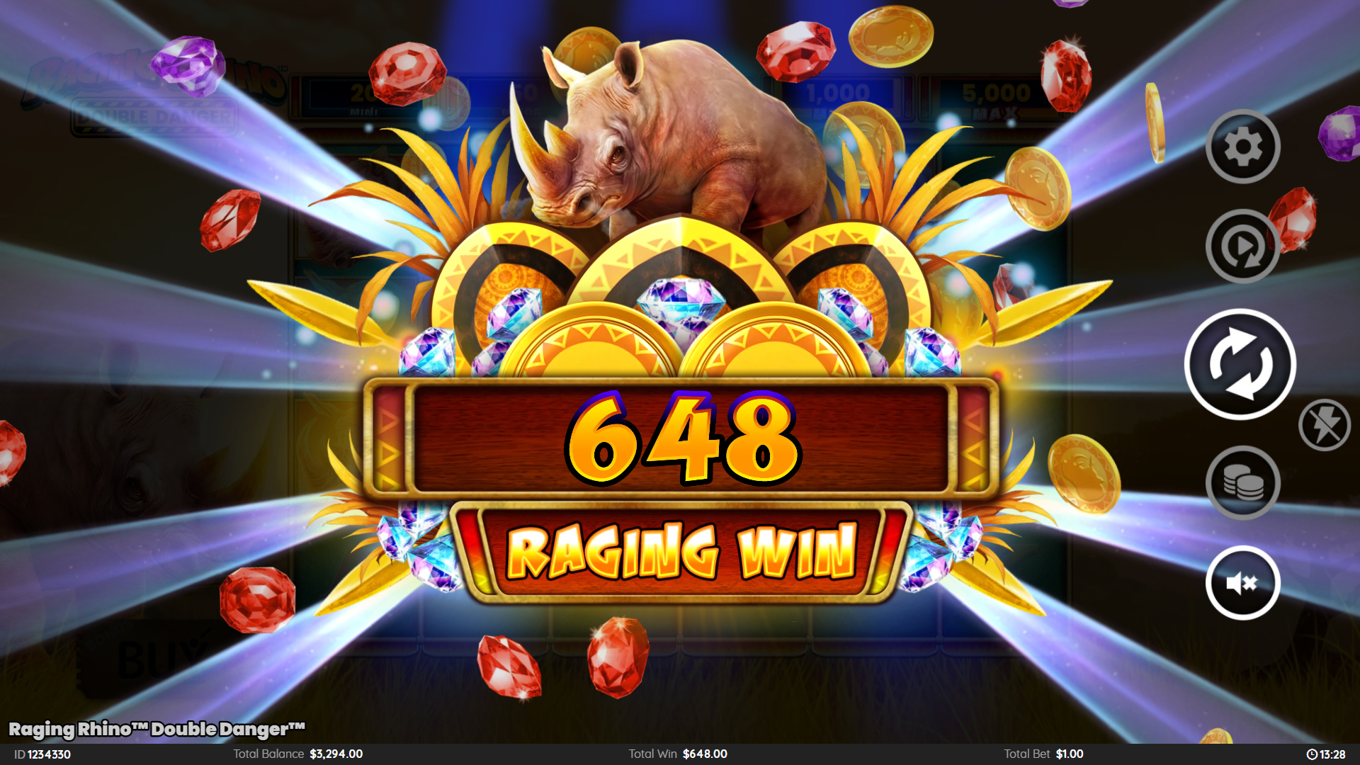 Charge toward massive wins with the mighty Rhino in this medium/high volatility game, offering max wins of up to 5,000x.