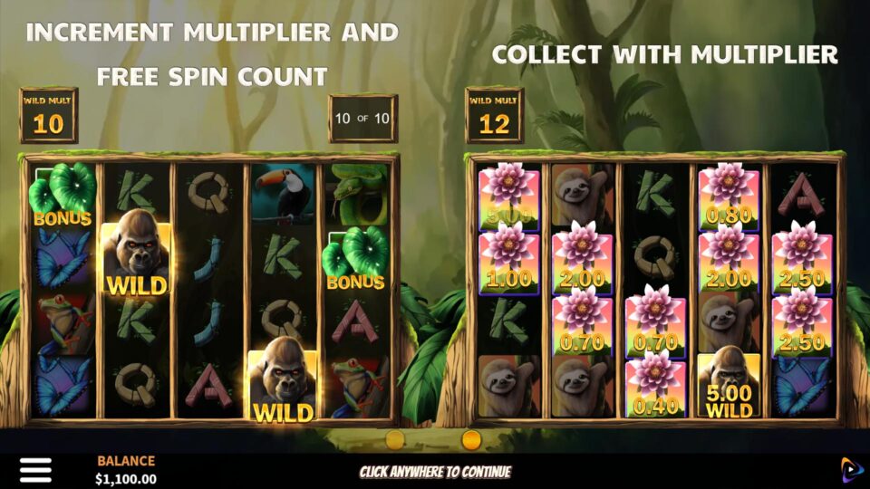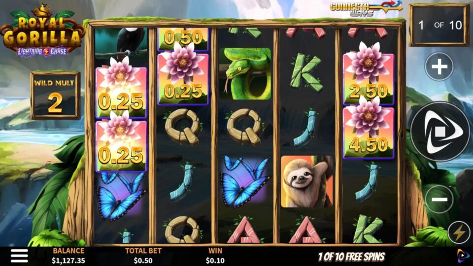 Venture deep into the heart of the rainforest in Royal Gorilla where the mighty ruler of the jungle guards ancient treasure and golden wins! 3 bonus symbols triggers free spins with wild multipliers! And the wins don't stop there; 6 or more flowers triggers the hold & respin feature! Cover the screen in flower symbols to award a grand prize of 250x!